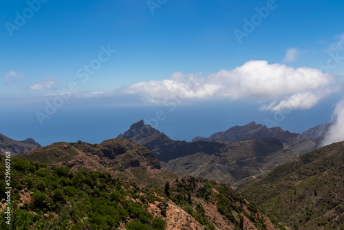 Panoramic view on the Teno mountain massif seen from summit Pico Verde, Tenerife, Canary Islands, Spain, Europe. Hiking trail between Masca and Santiago. Clouds over lush green hills. Tropical climate
