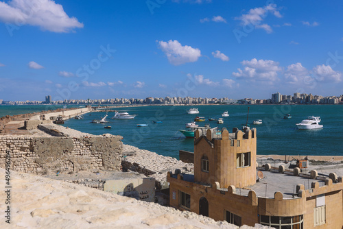 Panoramic View to the City of Alexandria with Citadel, Mediterranean Sea Embankment, Road, Streets and Local Buildings, Egypt