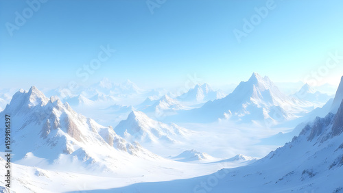 Panoramic vista of snow-capped mountains under a clear, light blue sky with soft lighting