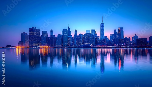 Panorámica de ciudad moderna al atardecer con reflejos en el agua y tonos azules