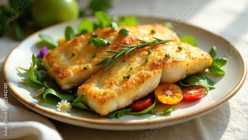 Pan-Seared Fish Fillets with Herb Garnish and Fresh Salad on a Plate