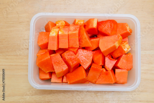 papaya fruit that has been cut into small pieces in a plastic container on a wooden table