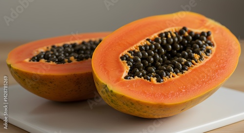 Papaya with Seeds Exposed on White Ceramic Board