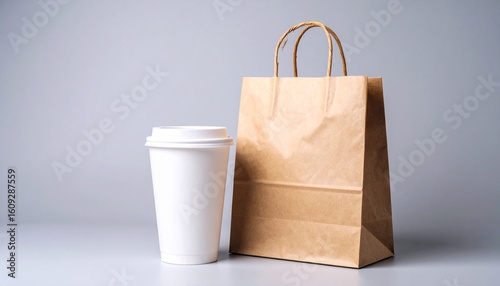 Paper Bag with Twisted Handle and Takeaway Cup on Gray Background – Eco Friendly Packaging