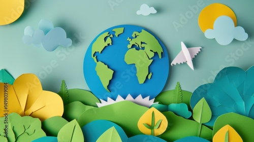 Paper Craft Illustration of Earth with Flowers and Clouds