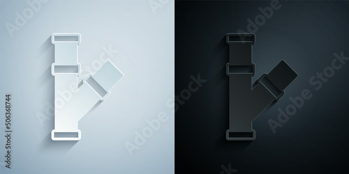 Paper cut Industry metallic pipe icon isolated on grey and black background. Plumbing pipeline parts of different shapes. Paper art style. Vector