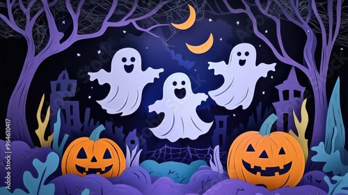 Paper cut style illustration of playful ghosts and pumpkins dancing under the moonlight