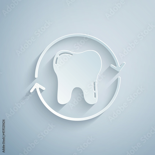 Paper cut Tooth whitening concept icon isolated on grey background. Tooth symbol for dentistry clinic or dentist medical center. Paper art style. Vector
