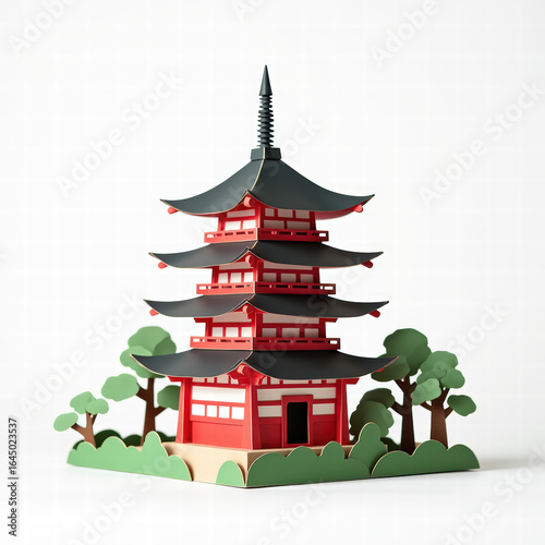 hand-made, model, architecture, culture, tradition, miniature, art, design, east asia, asian, temple, building, structure, spiritual, historical, craft, hobby, creativity, decorative, foliage, tree, green, red, white, stacked, level, roof, church steeple, detail, serene, peaceful, tour tourism, landmark, artistic, craftsmanship, design element, ornamental