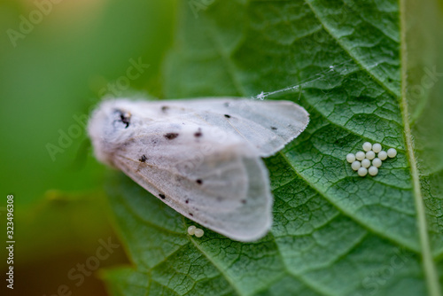 Papillon Ecaille mendiante ou Diaphora mendica sur une feuille avec ses oeufs