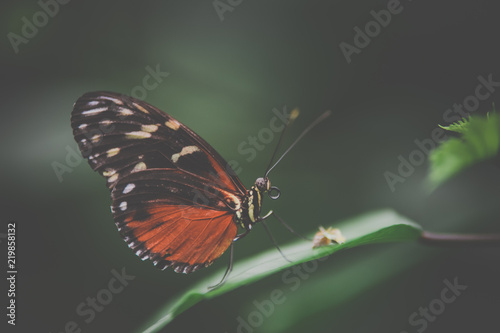papillon seul orange blanc et noir sur fonds sombre en vue horizontale dans un jardin posé sur une feuille verte