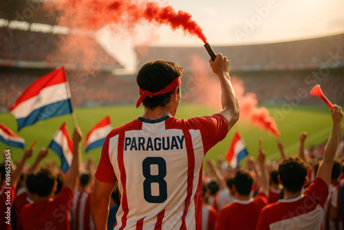 paraguay, soccer, fan, supporter, stadium, celebration, male, man, young, light, skin, short, hair, red, white, striped, jersey, flare, smoke, cheer, sport, football, crowd, team, national, culture, oneness, passion, energy, identity, excitement