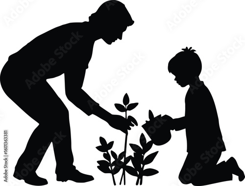 Parent And Child Planting Saplings Silhouette | Planting Trees Together As Family
