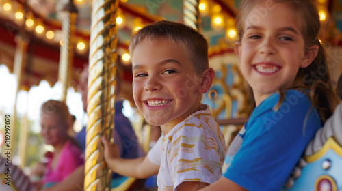 children, carousel, ride, colourful, smile, dynamic, dramatic, composition, happiness, joy, amusement, fun, entertainment, laughter, excitement, family, bonding, memory, adventure, motion, light, music, movement, spinning, animal, horse, lion, tiger, bear, fantasy, magical, enchanting, whimsical, fairy tale, exhilarating, thrilling, enjoyment, thrill