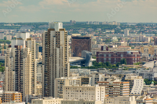PARIS, FRANCE - JUNE 23, 2016: Aerial view from Basilica of the Sacred Heart of Jesus stands at the summit of the butte Montmartre - highest point in the Paris. Telephoto lens shot