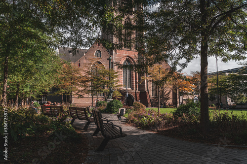 church, bench, park, tree, shade, old, garden, cathedral, nature, green, wood, architecture, wall, house, tree, path, castle, seat, summer, chair, building, autumn, landscape, grass, stone, wooden, religion, religious, window, big, rotterdam, holland, holland, europa, sunlight, light, view, beautiful, comfortable, warm