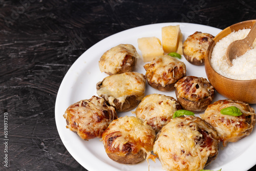 Parmesan-stuffed mushrooms on a black background. Stuffed mushroom caps with cheese, selective focus