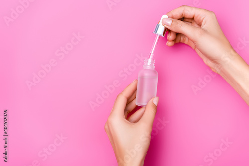 partial view of woman holding dropper and bottle of cuticle remover on pink background