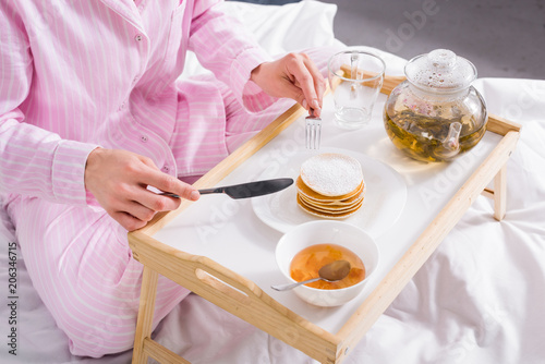 partial view of woman in pajamas having pancakes with jam for breakfast in bed at home