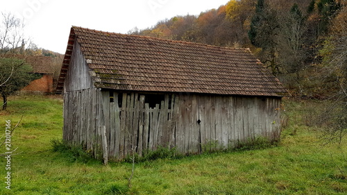 Partially broken old country barn with missing boards and small roof tiles surrounded with high uncut grass, plants and large trees