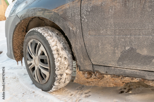 Parts of the car are covered with snow and ice after a snowfall. Wheel close-up in dirt and anti-icing reagents. Big frosts and a lot of snow in the city. Problems on winter slippery roads.