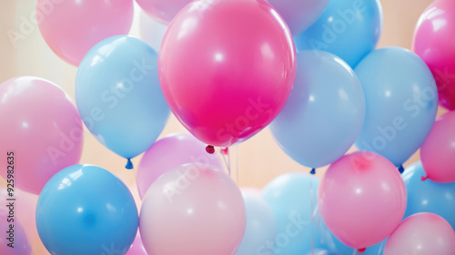 party festive birthday photo zone with pink and blue balloons. copy space for text, detailed high definition image