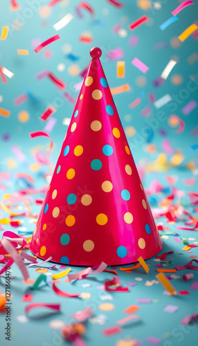 party, hat, celebration, theme, with, confetti, on, a, bright, background, dynamic, motion, birthday, christmas, holiday, decoration, tree, cone, fun, vector, illustration, object, new, cap, celebrate, colours, party hat, christmas, year, card, design, festive, symbol
