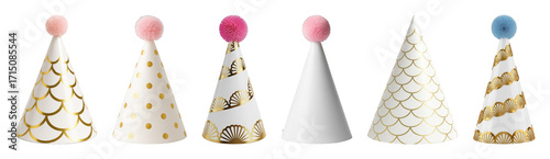 party, hat, celebration, birthday, festive, gold, white, pom-pom, design, event, occasion, decor, decoration, headwear, accessory, polka, dot, scallop, fan, pattern, patterned, solid, pink, blue, colourful, happy, joy, fun, playful, elegant, chic, modern, luxury, graphic, element, collection, set, holiday, anniversary, special, greeting, invite, invitation, children, children, adult, cute, style, variety
