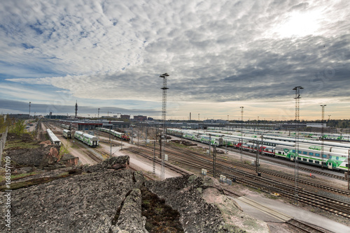 train, helsinki, finland, station, railway, travel, passenger, transportation, city, platform, transport, modern, summer, architecture, day, building, perspective, urban, electric, railroad, central, nobody, line, scandinavia, europa, historic, car, vehicle, sunshine, destination, traffic, public, lane, rail, carriage, locomotive, commuter, sky, blue, fisheye, panoramic, view, top, far