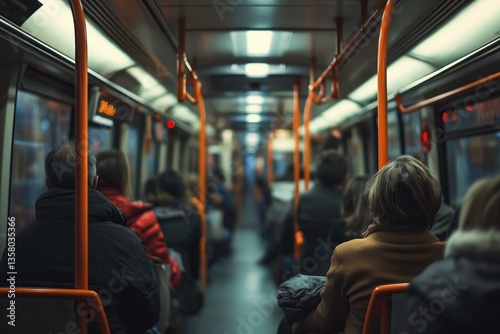 train, subway, public, transit, transport, transportation, commute, commuting, passenger, urban, city, interior, inside, travel, traveling, trip, lifestyle, back, view, anonymous, unrecognizable, seat, sitting, rail, railroad, blurred, background, artificial, light, dim, indoor, anonymity, modern, subway, journey, system, rush, hours, daily