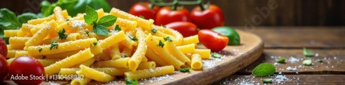 Pasta arrangement on a wooden table, with various Italian ingredients and herbs , basil, pasta