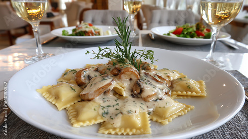 food, meal, plate, pasta, ravioli, mushroom, cream, sauce, dish, white, epicure, lunch, delicious, dinner, cookery, cheese, healthy, cooked, eatery, italian, vegetable