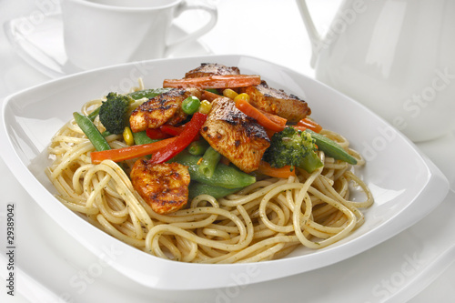 pasta, chicken, noodle, bean, broccoli, carrot, paprika, sauce, vegetable, food, fresh, green, nourishment