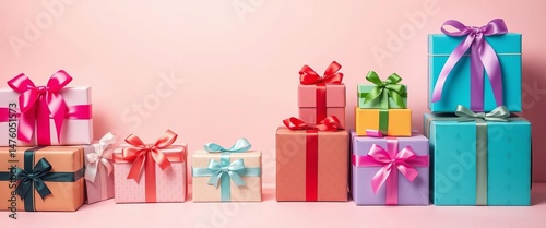 Pastel background, assorted gift boxes, beautifully tied ribbons, ample copy space, mockup, colorful