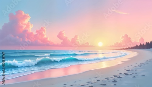 Pastel beach sunset. Calm turquoise waves wash ashore white sandy beach. Soft pink clouds fill sky above. Sun sets peacefully over tranquil scene. Vacation mood. Tranquil ocean shore. Pink sky.