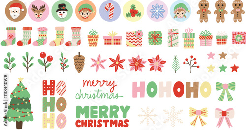 christmas, holiday, winter, christmas, festive, candy cane, gift box, cookie, reindeer, santa, snowman, stocking, star, christmas tree, snowflake, decoration, holly berries, christmas flower, flower, foliage, ribbon, merry christmas, handwriting, greeting, cartoon, clip art, cut-out, doodle, flat, graphic, illustration, individual, isolated, journal, planner, scrapbook, sticker, stylised, transparent, vector, children, naive