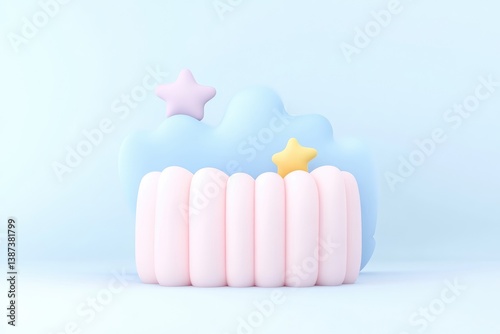 Pastel cloud and star scene. A light blue background showcases a light pink, ribbed form, resembling a cloud or cushion, with pastel pink and light blue clouds and stars. It evokes a soft, playful,