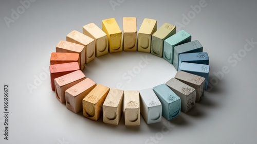 Pastel color palette of painted wooden blocks arranged in a circle on a white surface