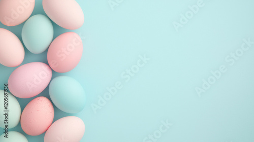 Pastel colored Easter eggs arranged on light blue background, creating festive and minimalistic composition