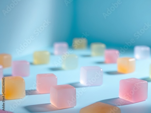 Pastel Colored Jelly Cubes on Blue Background, Playful Light and Shadow, Abstract Composition