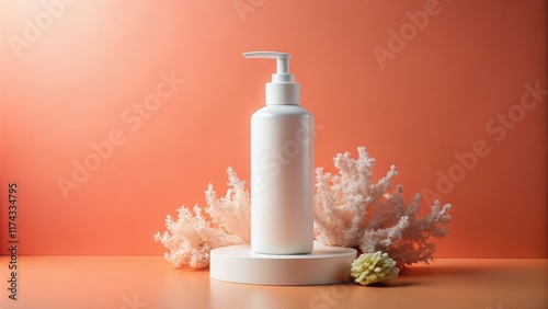 lotion, bottle, white, coral, pastel, background, platform, professional photo, beauty, skincare, cosmetic, cardboard box, design, advertising, display, still life, studio photography, photo, image, graphic design, digital artwork, illustration, three-dimensional, rendering, beauty product, high-quality, realistic, photorealistic, clean, modern, elegant, minimalist, simple, smooth, texture, light, shadow, composition, e-business