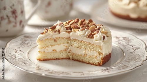 pastel, almond, cake, moist, soft, cream, cheese, frosting, sliver, porcelain, plate, floral, elegant, traditional, cultural, authentic, festive, artisanal, layered, comforting, sweet, bold, textured, iconic, bakery, dessert, delicious, food, pastry, cupcake, tasty, cookie, sugar, chocolate, baked