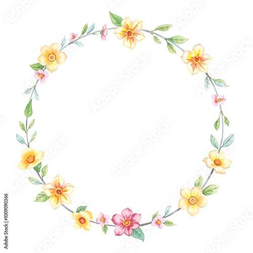 Pastel drawing artistic image of floral wreath as a frame for round white space. some leaves or flowers may overlap that white background. it has to be colorful, look natural. Generative AI