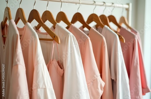 shirt, pastel, fashion, clothing, apparel, hanger, clothes rack, minimalism, style, soft, elegant, closet, organisation, tidy, neat, clean, simple, modern, chic, feminine, casual attire, collection, display, retail, boutique, shop, store, purchase, buy, sell, spring, summer, light, airy, delicate, clothes