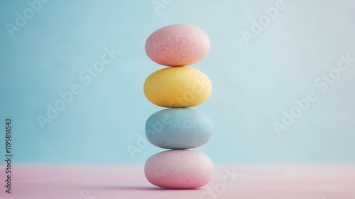 Pastel eggs stacked, spring background, balance concept, holiday card