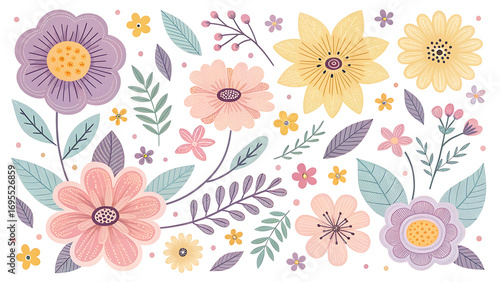 floral, vector, pattern, design, background, blossom, flower, leaf, illustration, art, pastel, spring, summer, nature, decorative, drawing, watercolor, element, graphic, artwork, vintage, beautiful, botanical, isolated, template, card, colourful, cute, fabric, print, textile, wallpaper, scrapbook, surface, pretty, artistic, hand-drawn, romantic, elegant, scrapbooking, flat, lay, aesthetic, gentle