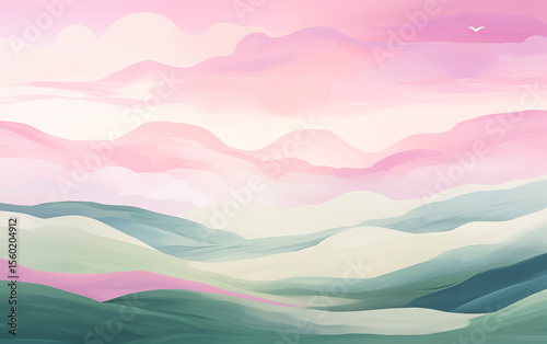 pastel, landscape, painting, hill, pink, sky, bird, distance, green, white, artwork, scenery, nature, art, illustration, design, mountain, vista, serene, calm, peaceful, dreamy, soft, abstract, watercolor, background, texture, gradient, graphic, image, visual, element, scene, view, horizon, flight, silhouette, dawn, dusk