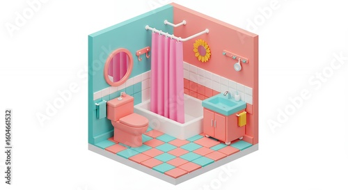 bathroom, interior, design, miniature, isometric, pink, teal, modern, home, house, decoration, shower, privies, vanity, tub, accessory, minimalism, illustration, decor, styling, pastel, colours, cute, geometry, three-dimensional, block, clean, architecture, visual arts