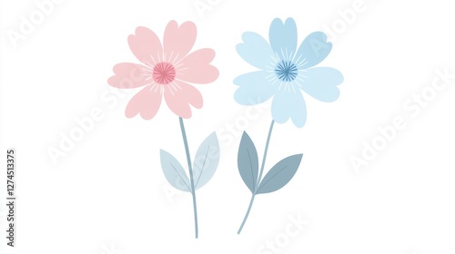 Pastel pink and blue flowers, simple design, white background, spring illustration, for greeting cards