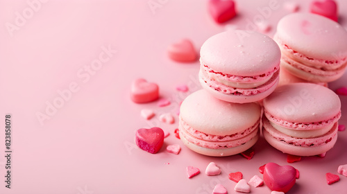 Pastel pink assorted macaroon with hearts isolated on pink background, perfect gift for Valentine's Day or Mother's Day, ideal for bakery menus or advertising.